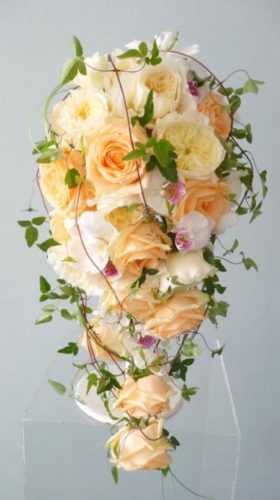 Rangkaian mawar dengan tanaman hias gantung ini patut Anda coba. Tanaman gantung apapun itu sebenarnya bisa digunakan, asal porsinya tidak banyak agar tidak menutupi keindahan mawar itu sendiri