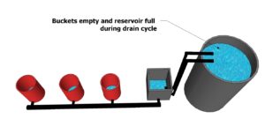 Jenis ini memerlukan biaya yang lebih mahal karena banyak peralatan yang dibutuhkan. Sistem ini bekerja pada prinsip pasang surut dengan tanki serge. Tangki serge bekerja dengan memompa air dari wadah yang lebih besar. Setelah timer untuk pompa di wadah utama mati, pompa di tanki serge kembali memompa seluruh air kembali ke wadah utama sampai level airnya cukup rendah. Saat itu juga katup pelampung kedua menutup pompa di tangki serge.