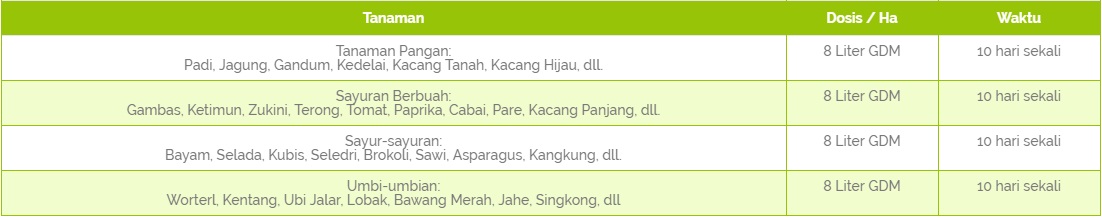 Pupuk GDM ini cocok untuk tanaman pangan dan sayur-sayuran, seperti tanaman padi, jagung, bayam, kangkung, sawi, wortel, kacang panjang, kubis, tomat, bawang putih, brokoli, dan lain-lain.