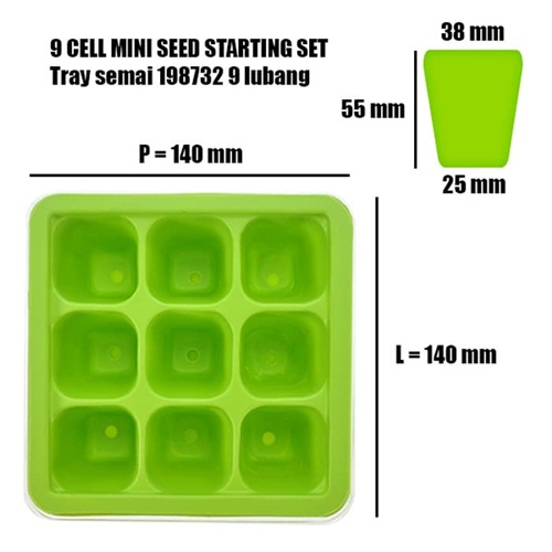 Tray semai 9 lubang adalah salah satu produk tray semai mini yang kami jual, berukuran 14 cm x 14 cm x 5,5 cm, lengkap dengan alas dan penutupnya. Alas tray semai dapat dimanfaatkan untuk masa perendaman benih, sedangkan penutupnya dapat digunakan untuk menjaga agar bibit tetap bersih dan terhindar dari hama tanpa menghalangi masuknya cahaya matahari.